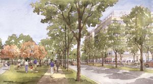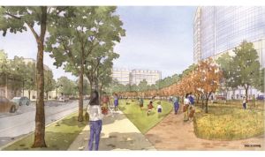Sketch of Nationwide Children’s new 6-acre park along East Livingston Avenue looking West: new main hospital on right, Research Building III in background