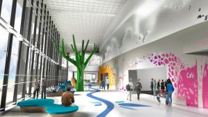 Rendering of first floor atrium in new main hospital; shows way-finding tools with pathways highlighted by bursts of color at important touch points