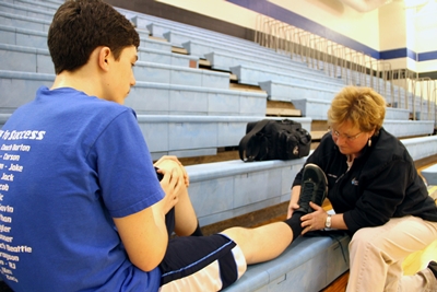 Kerry Waple, ATC, a certified athletic trainer in Sports Medicine at Nationwide Children’s, assesses a young athlete during basketball practice.