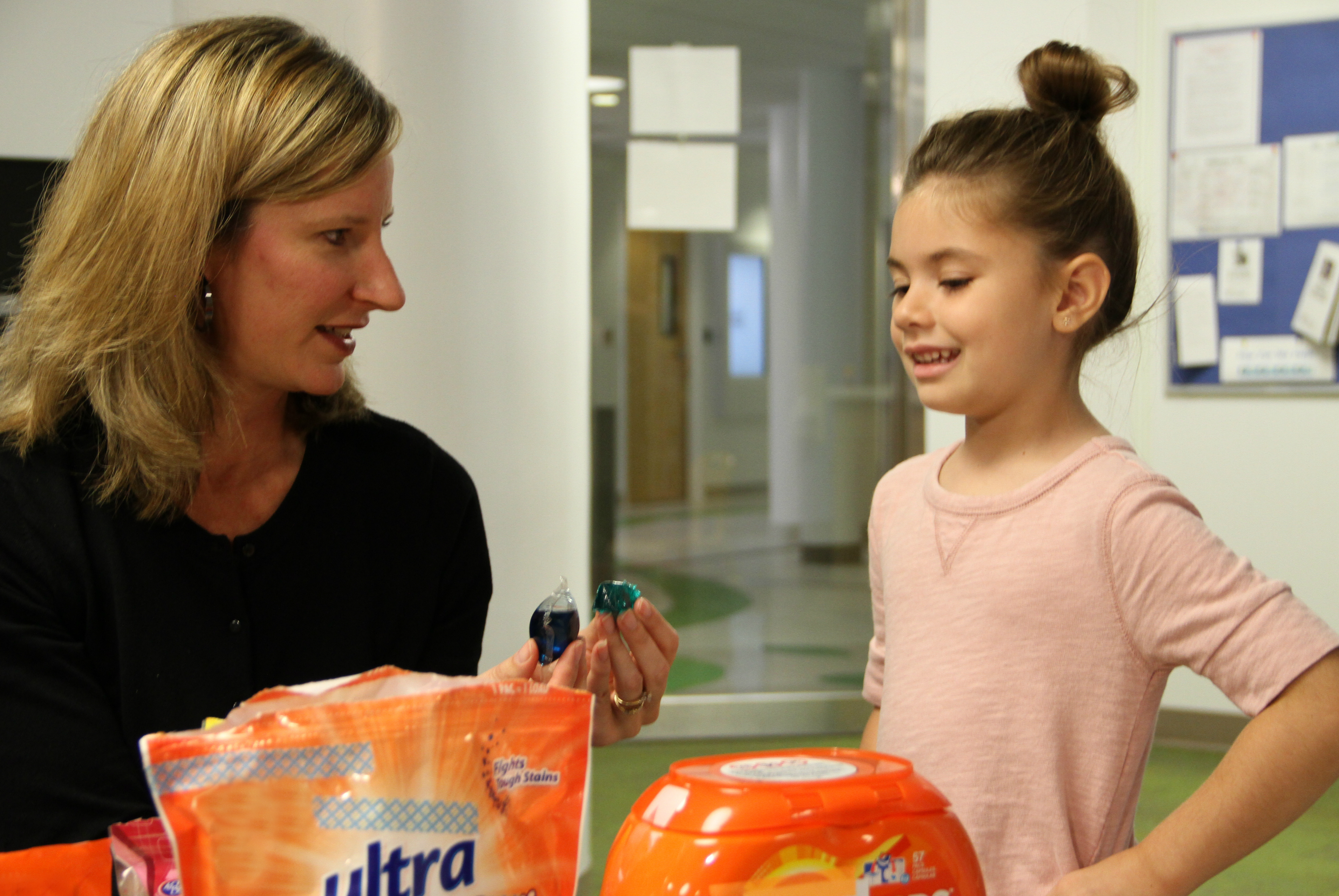 Tracy Mehan from the Center for Injury Research and Policy talks with a young girl who has trouble distinguishing an actual laundry detergent pod from a look-alike that researchers created with a fruit flavored drink.
